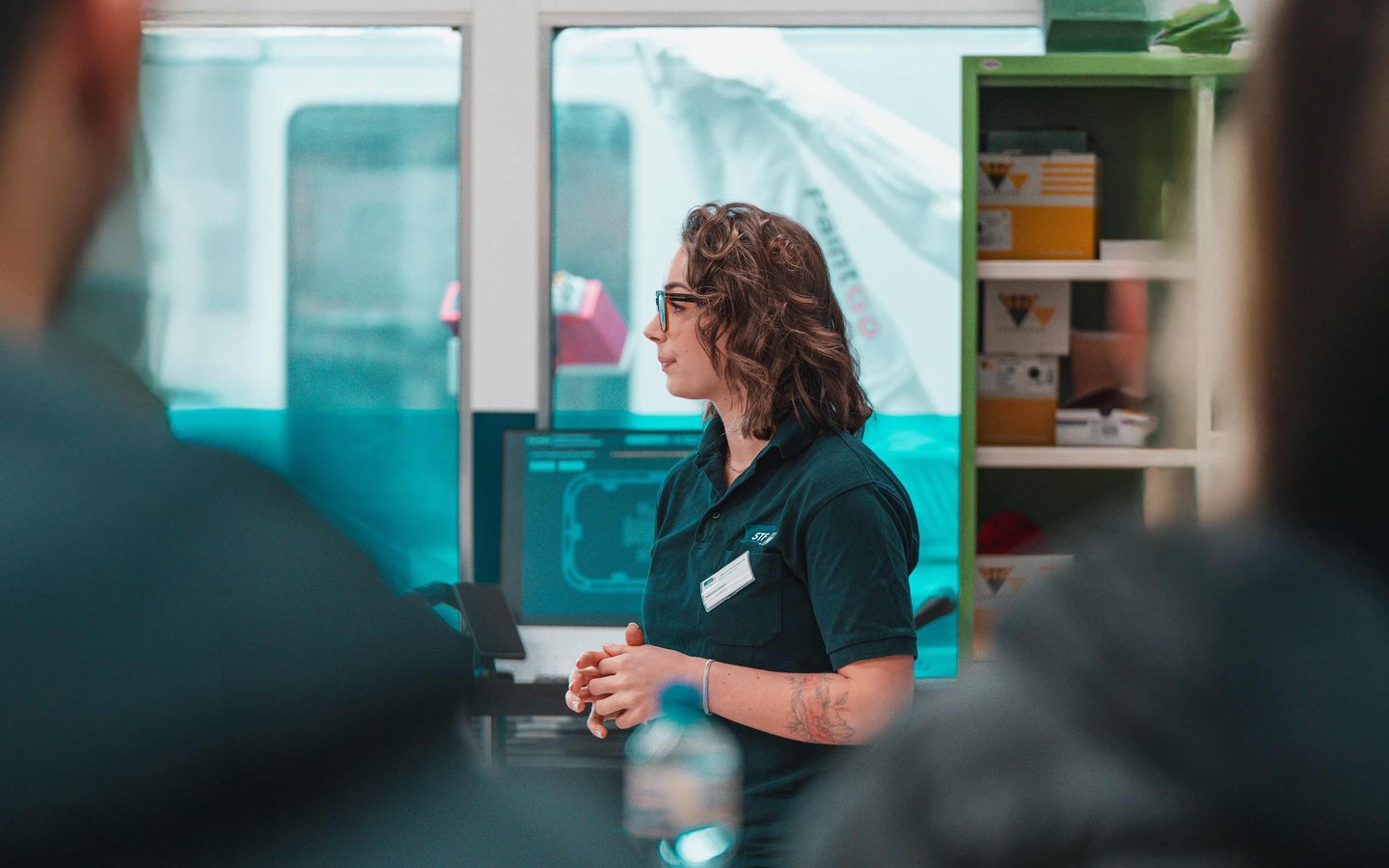 , vorgestellt von Fachlehrerin Valentina Kasper und Patric Nägelin von BLUTECH. Der vollautomatisierte Roboter vermass und lackierte eigenständig Werkstücke vor den Augen der Zuschauen. Er ist ein Beispiel dafür, wie moderne Systeme die Arbeit im Carrosseriegewerbe unterstützen, ohne das Know-how des Menschen zu ersetzen.
